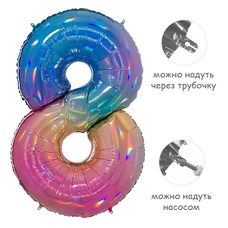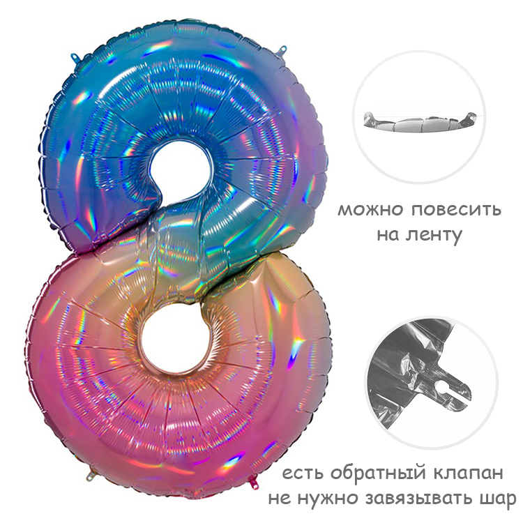 Фольгированный воздушный шар в форме цифры. Изготовлен из тонкой миларовой пленки с голографическим эффектом, позволяющей шару не сдуваться в течение нескольких дней.Фольгированные воздушные шары надувают через клапан. Поэтому плотно надутый шар завязывать не требуется - обратный клапан хорошо удерживает гелий внутри шара. К шару привязывают ленту только для того, чтобы шар не улетел.