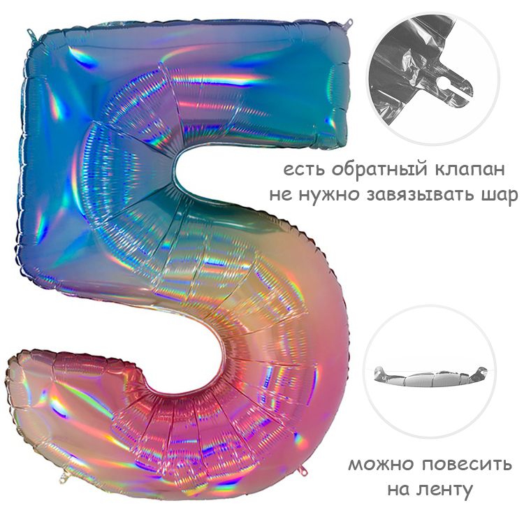 Фольгированный воздушный шар в форме цифры. Изготовлен из тонкой миларовой пленки с голографическим эффектом, позволяющей шару не сдуваться в течение нескольких дней.Фольгированные воздушные шары надувают через клапан. Поэтому плотно надутый шар завязывать не требуется - обратный клапан хорошо удерживает гелий внутри шара. К шару привязывают ленту только для того, чтобы шар не улетел.