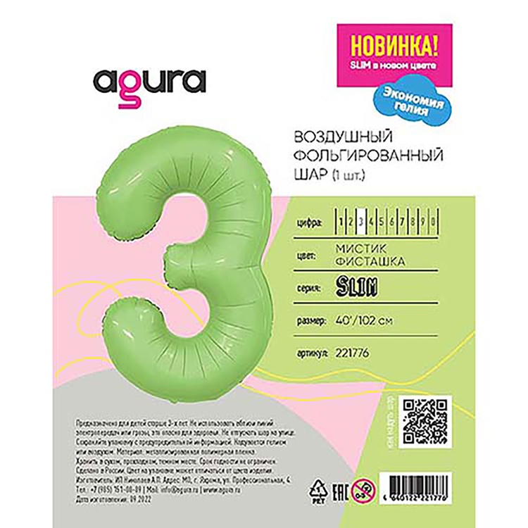 Воздушный шар цифра 3 сатин фисташковый 86см Россия