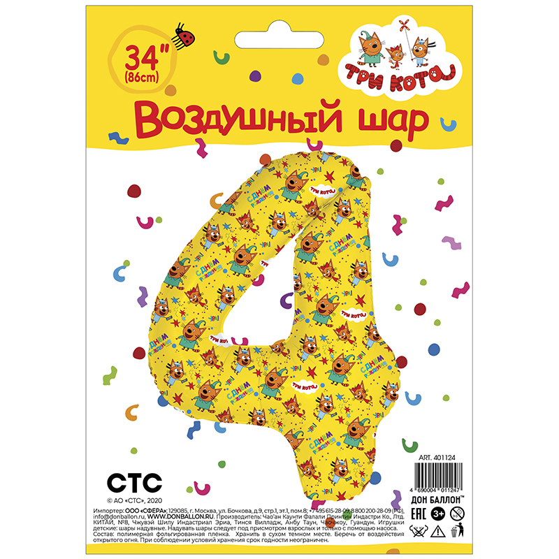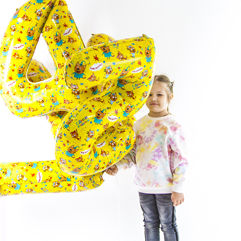 Воздушный шар цифра 4 Три Кота жёлтый 86см