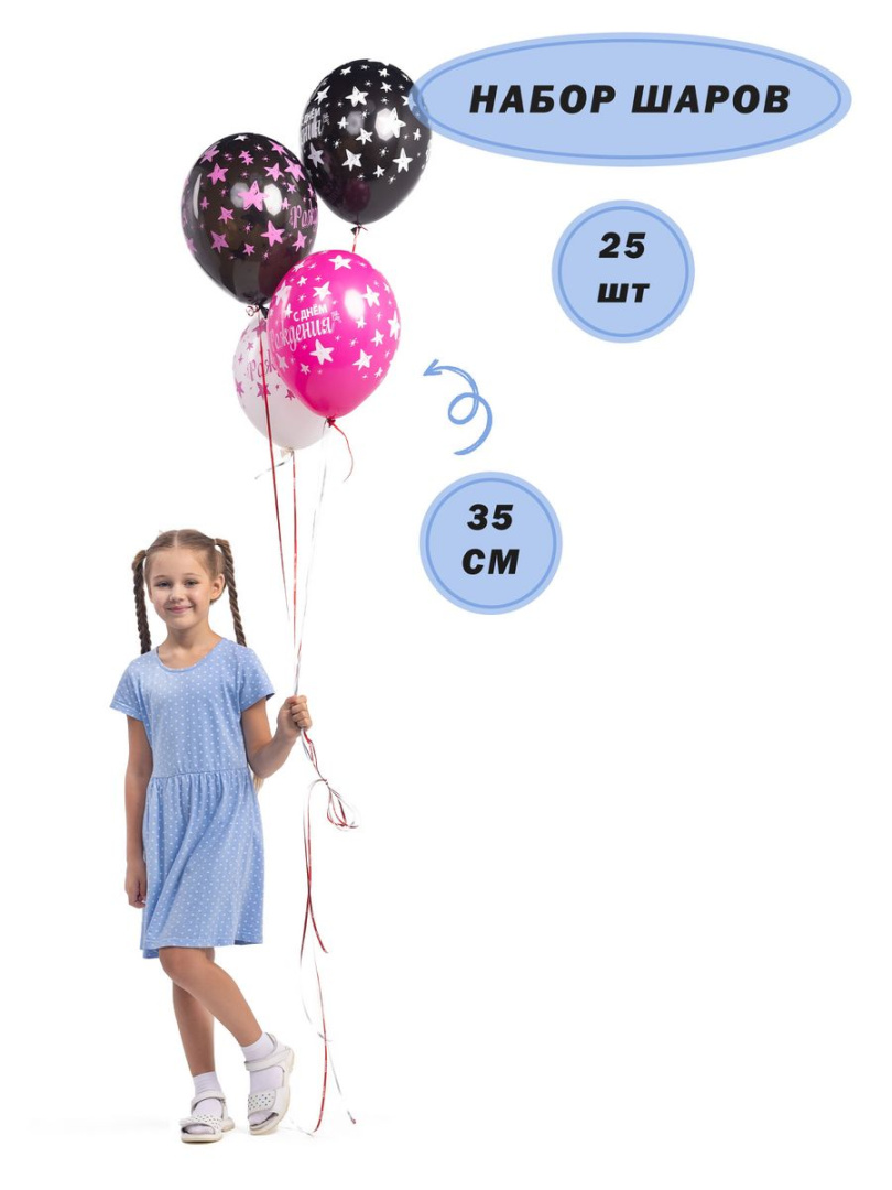 Воздушный шар "С Днем рождения!" от Весёлая затея - это набор из 25 штук розовых воздушных шаров с изображением звезд. Они изготовлены из натурального латекса, что гарантирует их прочность и долговечность.Шары имеют классическую форму и розовый цвет, который является одним из самых популярных и любимых у детей и взрослых.