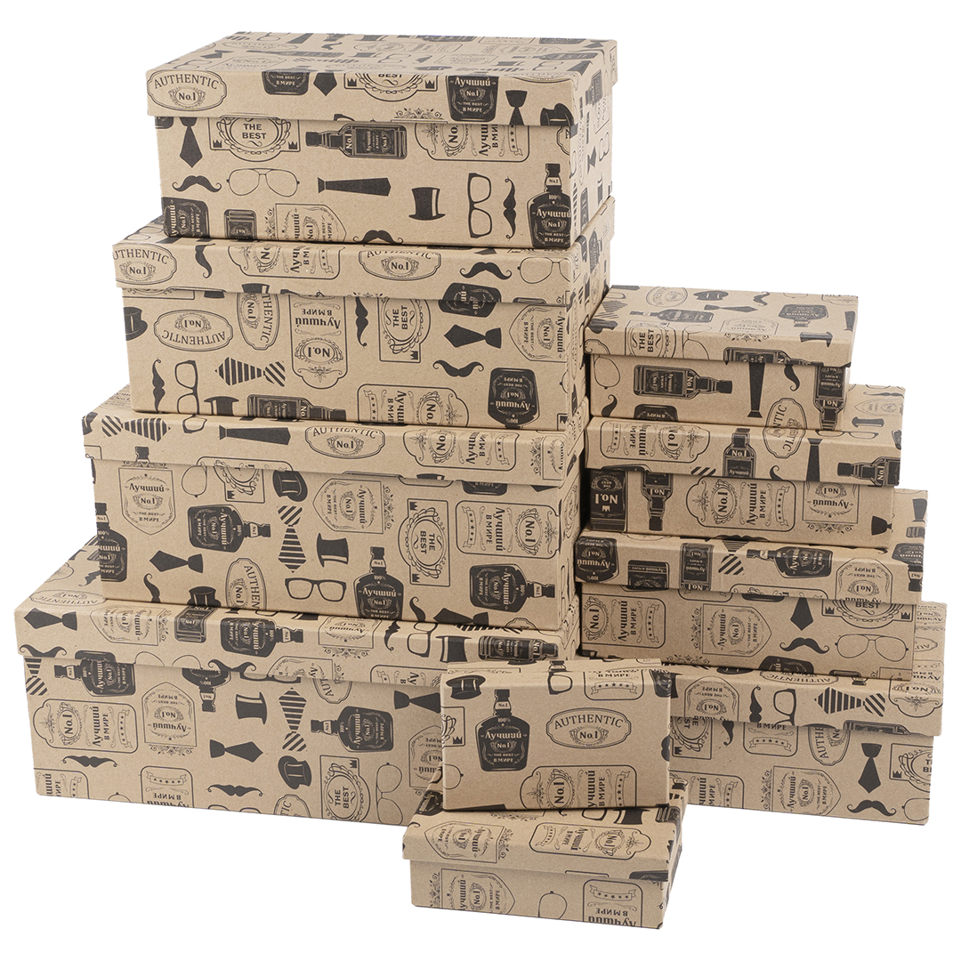 Набор подарочных коробок в едином стиле идеально подойдет для упаковки небольших презентов как для одного человека, так и для нескольких, а отличный плотный картон будет бережно его хранить. Также коробки можно использовать в качестве декоративных боксов, которые оригинально дополнят ваш интерьер.Размеры коробок: 33*20*13, 28,5*18,5*12, 26*17,5*11, 23,5*15,5*10, 21*14*9, 19*13*8, 17,5*11*7, 15*9,5*6, 13,5*8*5, 12*6,5*4 см.