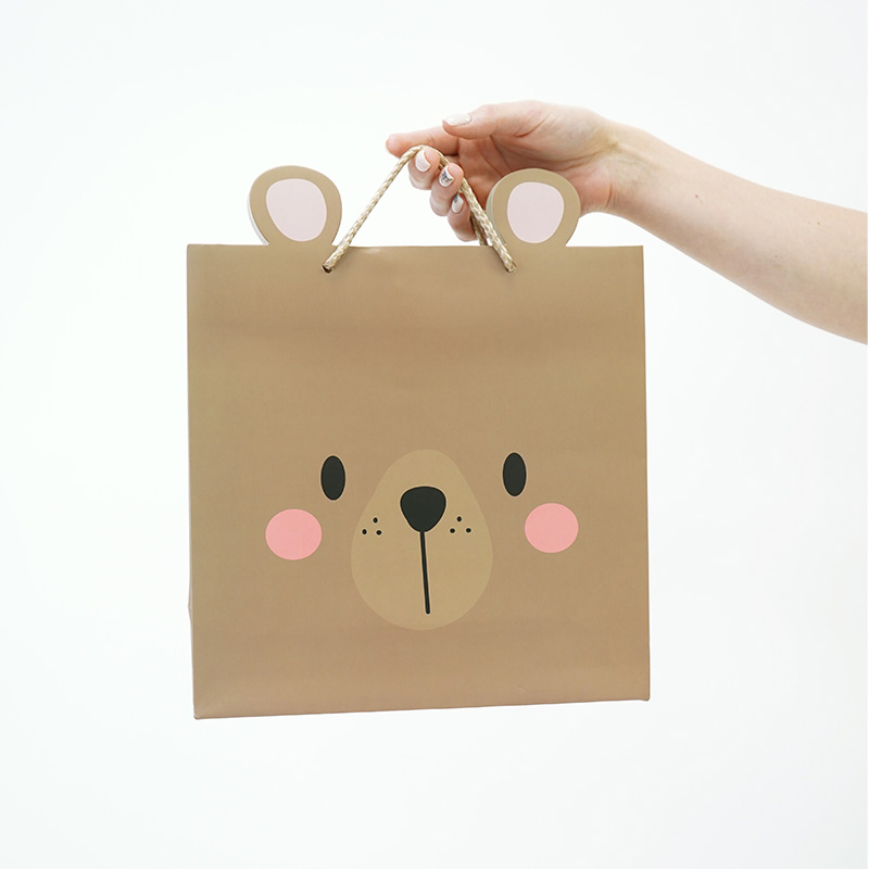 Подарочные пакеты это одни из самых популярных видов упаковки из-за своей универсальности и невысокой цены. Многообразие рисунков и размеров позволят подобрать упаковку для любого, даже самого притязательного человека.Забавный мишка с ушами уже спешит поздравить адреса с торжественным событием.