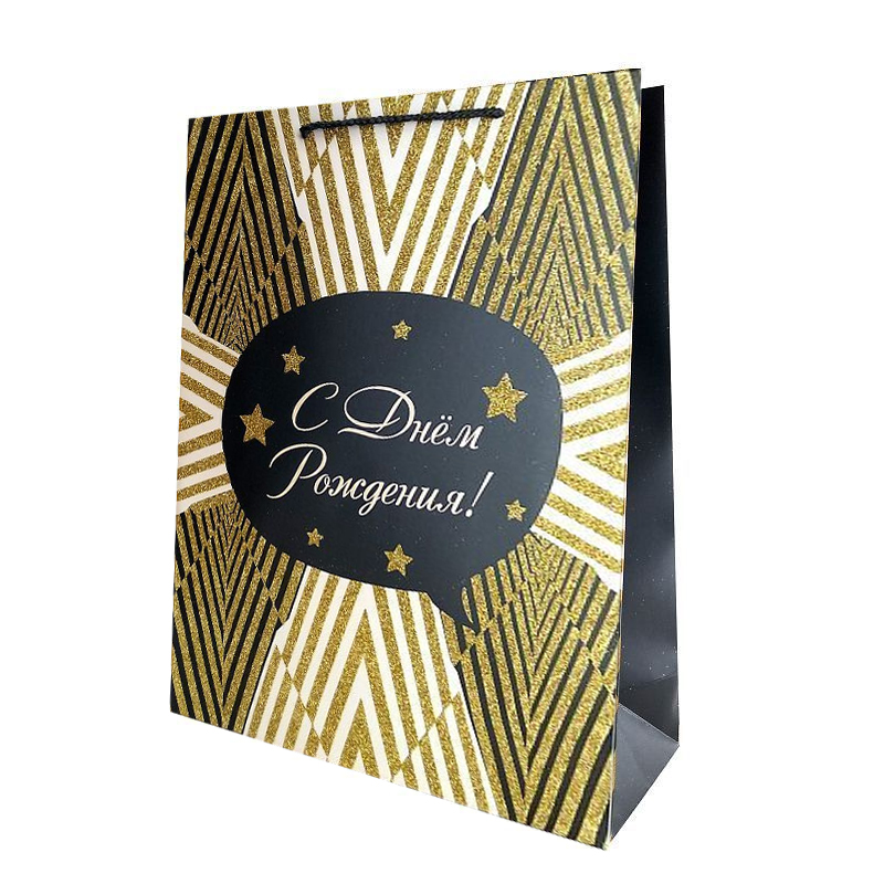 Снаружи пакет покрыт глянцевой ламинацией, что придает ему прочность, а изображению - яркость и насыщенность. Для придания дополнительного блеска надпись "С Днём рождения" и полосы покрыты глиттером.