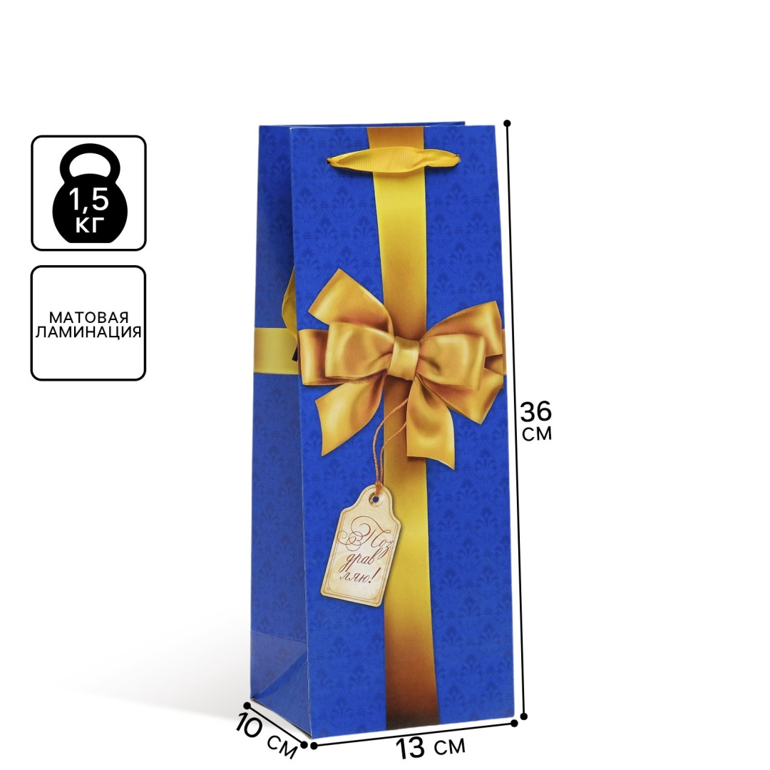 Пакет подарочный под бутылку упаковка С бантом 36х13х10см
