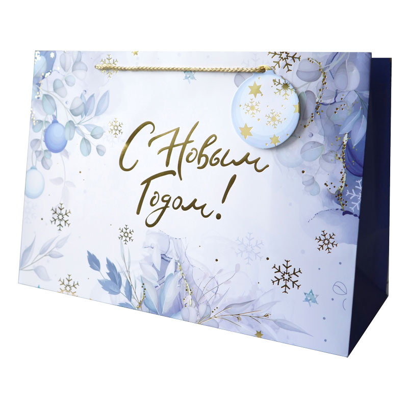 Снаружи пакет покрыт глянцевой ламинацией, что придает ему прочность, а изображению - яркость и насыщенность. Для придания дополнительного блеска на пакете есть элементы с тиснением фольгой.
