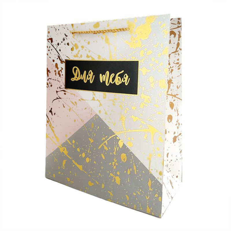 Подарочный пакет "Золотые брызги на мраморе" - простой, быстрый и удобный способ упаковки подарков к любому празднику.Пакет изготовлен из плотной бумаги, дно укреплено картоном, который позволяет сохранить форму пакета. Снаружи пакет покрыт глянцевой ламинацией, что придает ему прочность, а изображению - яркость и насыщенность. Для придания дополнительного блеска надпись "Для тебя" и некоторые элементы выделены тиснением фольгой.